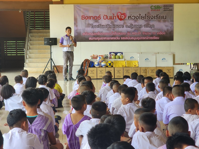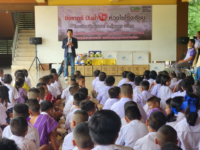 “คุณนราธิป วิรุฬห์ชาตะพันธ์ กรรมการผู้จัดการใหญ่ บมจ.ซิงเกอร์ประเทศไทย และคณะผู้บริหาร ร่วมส่งมอบความสุขให้กับน้องๆ โรงเรียนบ้านเซอทะ อ.อุ้มผาง จ.ตาก ในโครงการ “ซิงเกอร์ ปันน้ำใจ ห่วงใยโรงเรียน” ด้วยการสนับสนุนเครื่องกรองน้ำดื่มสะอาดซิงเกอร์ รุ่น RO-01 จำนวน 10 เครื่อง อุปกรณ์การเรียน อุปกรณ์กีฬา พร้อมทั้งจัดเลี้ยงอาหารกลางวันให้กับน้องๆ เมื่อวันที่ 16 พฤษภาคม 2568